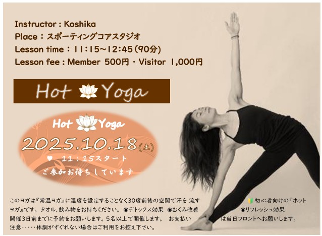 10月18日 土曜日 HOT YOGA BY小鹿IR 11:15~12:45 (90分間)